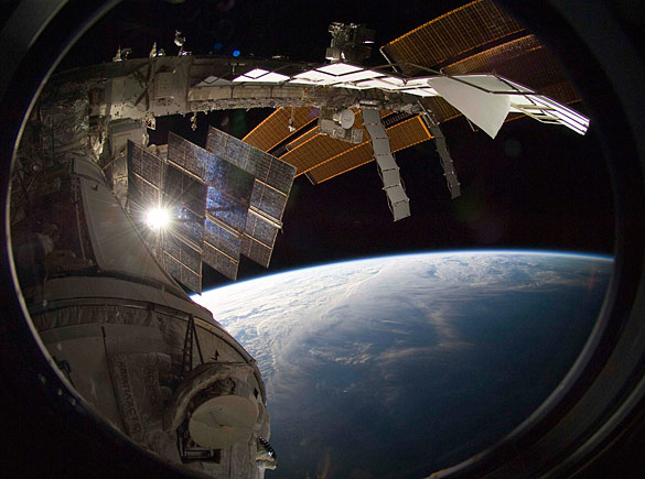 The night shift: The Lab is quiet, a large group of windows on the side of the room frame views of Earth and part of the space station. Two scientists walk out of their lab for a break.