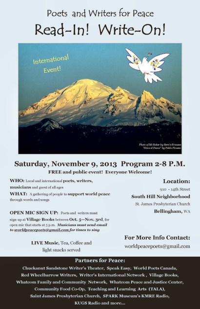 Some local poet and writer friends are organizing a World Peace Read-in! and Write-on! It will be held on Saturday, November 9, 2013 from 2 PM to 8 or 9 pm. at 910-14th Street (St. James Presbyterian Church). There will be an opening and welcome reception at 2 pm. People will be welcome to come later in the day and evening, but we want a crowd at the opening.