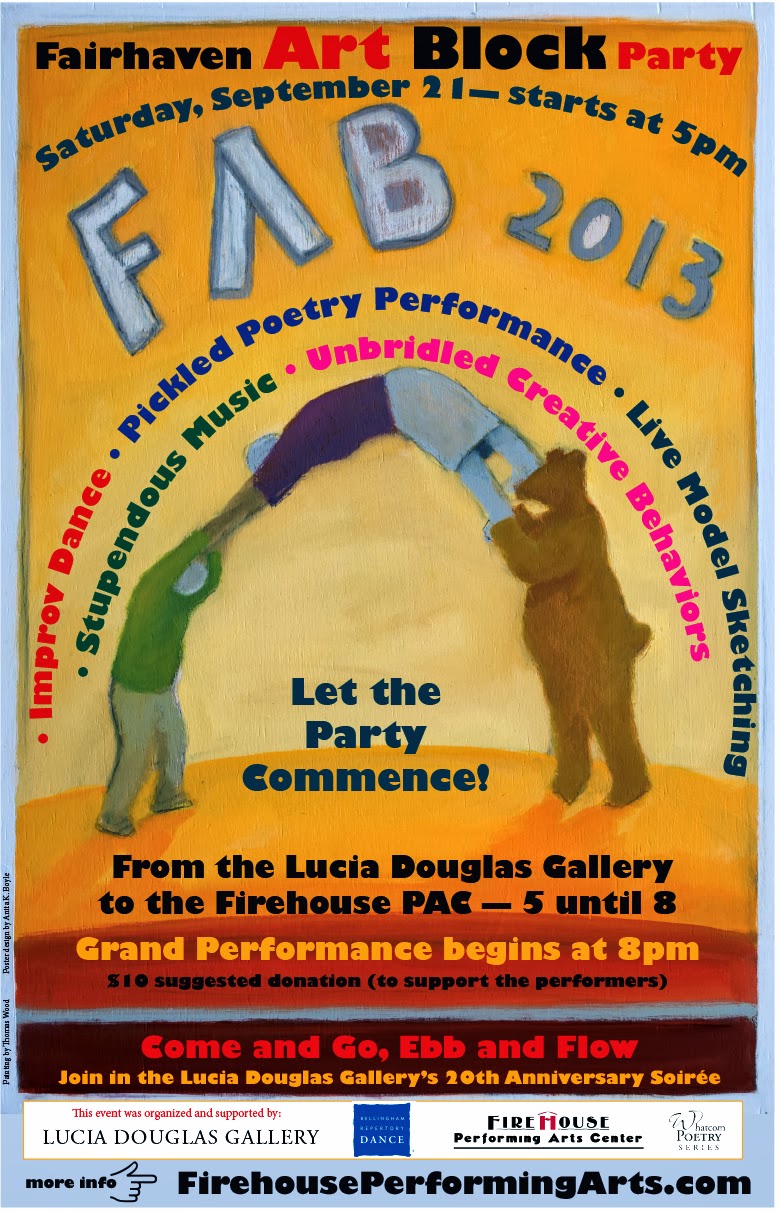 In September Carla and I, representing the Chuckanut Sandstone Writers Theater, had the privilege of working with the Bellingham Repertory Dance group, the Firehouse Performing Arts Center, and Lucia Douglas Art Gallery on a group project. We organized the street festival Fairhaven Art Block party, or FAB. This event was designed to share the artist community of Fairhaven with it’s residences. Folks were encouraged to walk from the art gallery to the Firehouse, just a block over, along a path littered with poets reading live poetry for any passersby. Music and dance intermingled with the guests. It will return for 2014.