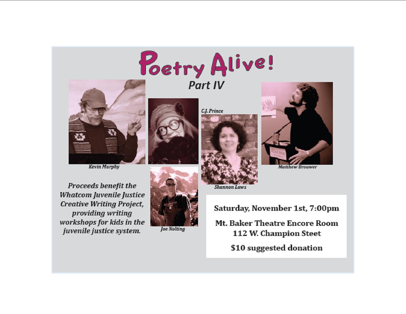 The last event I was fortunate to be a part of was in November, a fundraiser for the Whatcom Juvenile Justice Creative Writing Project. Held at the glamorous Encore Room at the Mt. Baker Theater. The audience was generous and responsive to touching poetry by all artists. Kevin Murphy was the exclamation point at the end of the evening with his bongo poems that everyone can relate to. Man, I love that guy!