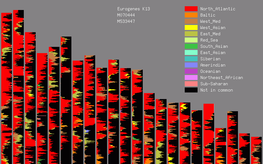 Here is how two sets of DNA look using a visual comparison option from GEDMatch. Each bar is one of my strands atop another participant. Color means a match, black is no match. Imagine each bar like a hair comb with “teeth”, solid horizontal color equals 100% match for that section, or “tooth”, and so on. This graph compares our ancestral connections.
