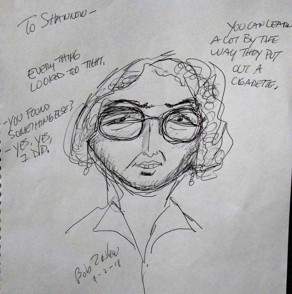 In my town, we have a monthly open mic at the local indie book store, Village Books. The night I signed up for a 5-minute read, a new artist was in the crowd-drawing, um, portraits… of each reader. Bob Zaslow–thank you. Bob included in his portrait lines from “Christopher Titus Save Me”.