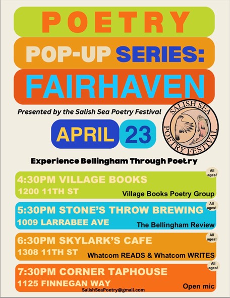 Join us for a free, all-ages “poetry crawl” through the heart of Fairhaven! We’ll start at Village Books at 4:30, then migrate to Stone’s Throw Brewing, Skylark’s Cafe, and the Corner Taphouse–listening to local poets at each stop. After a short reading at each venue, enjoy a drink or snack, visit with poets, and make new friends before moving on with the group. Bring a poem of your own to share during the open mic at our final stop. Full timetable: Village Books (featuring the Village Books Poetry Group) at 4:30, Stone’s Throw (featuring The Bellingham Review) at 5:30, Skylark’s (featuring Whatcom READS & Whatcom WRITES) at 6:30, and the Corner Taphouse (featuring an open mic!) at 7:30. Presented by the Salish Sea Poetry Festival, a branch of the Whatcom Poetry Series.