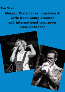 Morgan Paris Lanza, Executive Director at Bellingham Girls Rock Camp, Business Manager at Tillie Lace Gallery and School of Fine Art and musician joins the show this week. Morgan shares what life is like as a multi-faceted artist and the joys of teaching girls the power of music at the Girls Rock Camp. Also, she brings in a song from her jazz quintet, Impressions, called “No Moon at All.” You’re going to love it! Next up Pace Rubadeau, the internationally known trumpet player and music producer with Pace Productions visits us at the KZAX Make.Shift Radio studio in downtown Bellingham. Pace enjoys jazz from the 20-30’s era and supports the revival music scene as the new booking and event coordinator for the classic venue The Majestic. Pace also shares the joy of playing out in natural spaces, especially canyons with good acoustics, and describes what Pace Productions is all about.