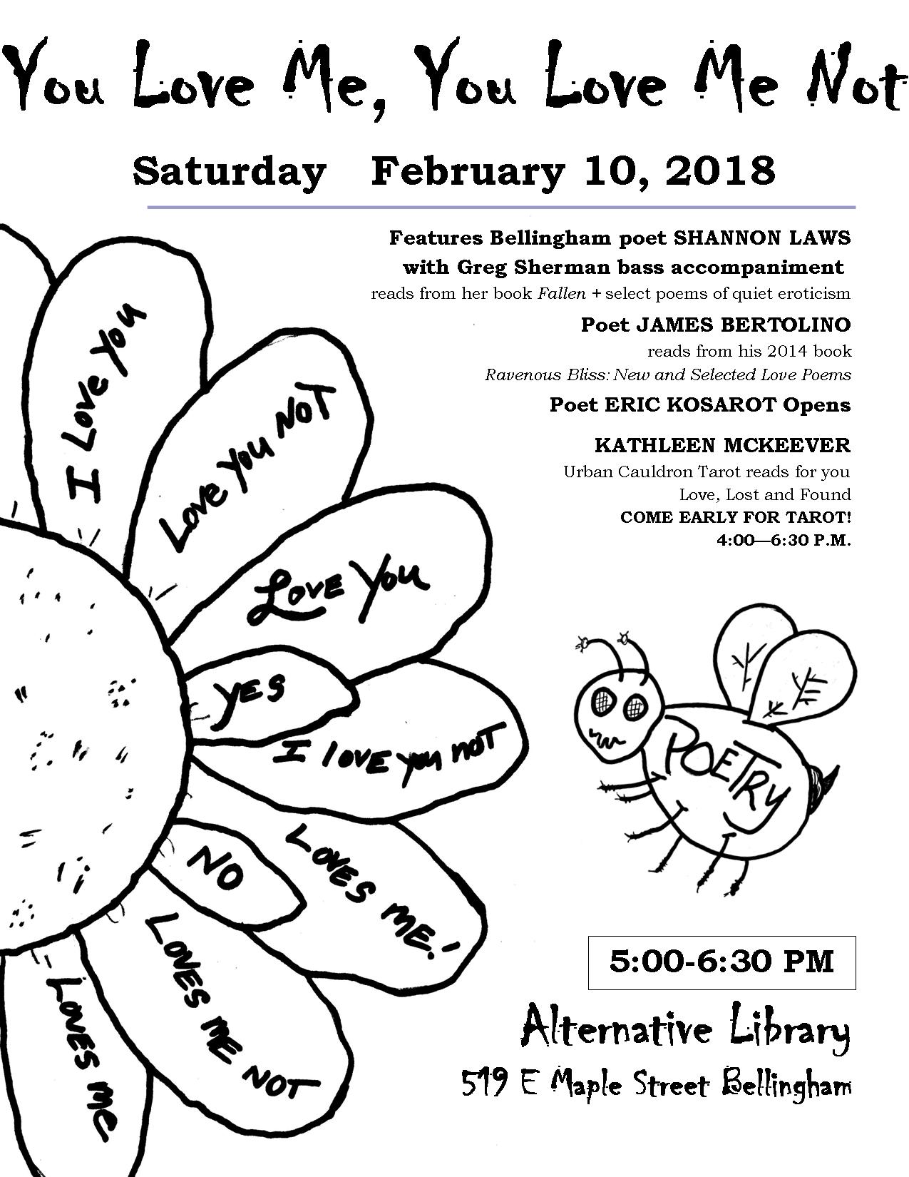 You’re invited… Save the Date! This event is an early 5:00 p.m. set designed for you and your sweetie to enjoy a special day together, a passionate spark to get things started. Also, a great time for anyone who is a fan of love and wants to support the Alt Library and local artist. (IContinueContinue reading “Event: You Love Me, You Love Me Not”