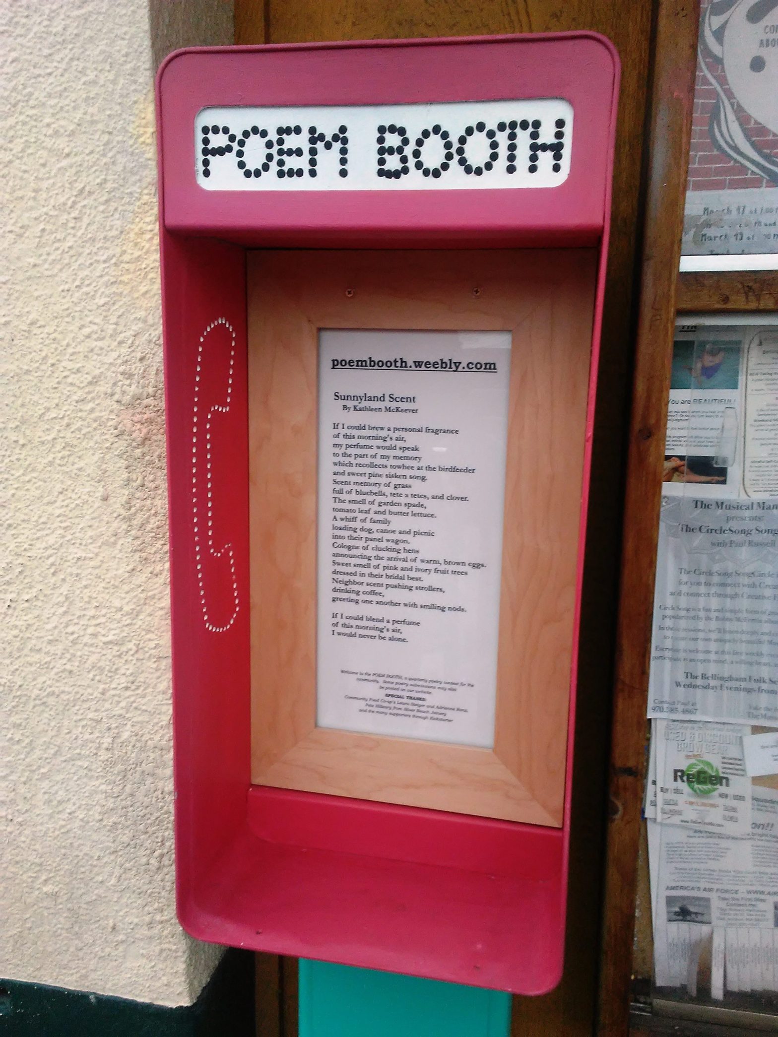 Poem Booth Bellingham Last month Christen Matix, Summer Starr and I shined up our smiles, polished our pens to present our proposal to the downtown Community Food Co-Op. We asked the board’s permission to convert the derelict phone booth on Forest Street, located outside next to the community board, into a Poem Booth. The board lovedContinueContinue reading “NEW! Poem Booth”